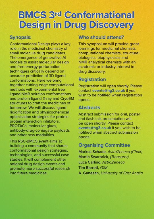 Conformational Design plays a key role in the medicinal chemistry of small molecule drug candidates. The emergence of generative AI models to assist molecular design and free-energy-perturbation techniques critically depend on accurate prediction of 3D ligand conformations. Here we bring together cutting-edge computational methods with experimental free ligand NMR solution conformations and protein-ligand X-ray and CryoEM structures to craft the medicines of tomorrow. We will discuss ligand rigidification and physicochemical optimisation strategies for protein-protein interaction inhibitors, PROTACs, molecular glues, antibody-drug-conjugate payloads and other new modalities. This RSC-BMCS event aims at building a community that shares conformational design strategies, technologies, and successful case studies. It will complement other rational drug design events and promote more successful research into future medicines.