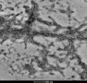 Transmission electron micrograph images of fibrillar mHTT generated in Cambridge from protein material expressed at Cantabio in Budapest.